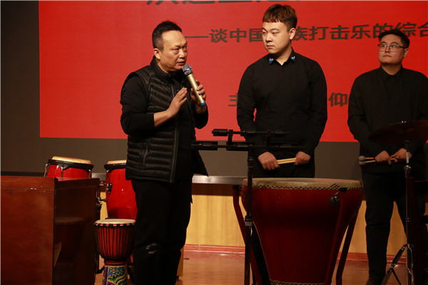 讲座中,张仰胜结合自己在山艺的求学经历,亲切勉励山艺学子要从艺术的初心启程,不忘初心,进而不断地实现人生价值。对“什么是打击乐”,他列举了安徽花鼓灯花鼓歌、河北常山战鼓、合肥巍山战鼓、陕西锣鼓、兰州太平鼓、安塞腰鼓等中国打击乐,介绍了他们各自的分布情况和艺术特色,引领师生领略全国各地代表性民间锣鼓的风采。他以排鼓的改良为切入点,介绍了中国民间打击乐的舞台艺术呈现及其历史演变,指出打击乐演奏经过不断发展,已从单一的伴奏形式演变为多样化舞台表演形式。