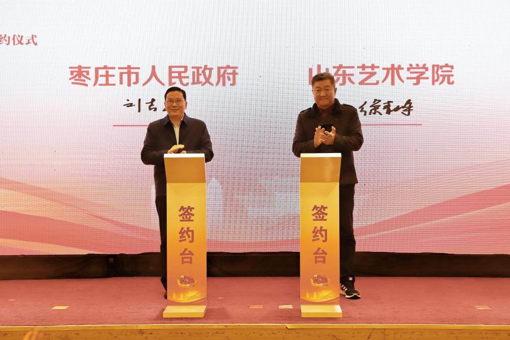 徐青峰在讲话表示,山东艺术学院高度重视专业建设与社会服务融合发展,注重发挥艺术学科专业优势、人才智力优势助力城市建设和乡村振兴。学校与枣庄市人民政府签署了全面战略合作协议、两个基地落户枣庄,是深入贯彻落实习近平总书记视察枣庄时“做好品牌、提升品质,延长产业链,增强产业市场竞争力和综合效益”的重要指示精神的具体举措。全面战略合作协议的签署,将进一步密切学校与省知联会、枣庄的联系,搭建起凝聚同心力量、艺术助力乡村振兴新的平台,绘就校地双方更加美好的发展图景。
