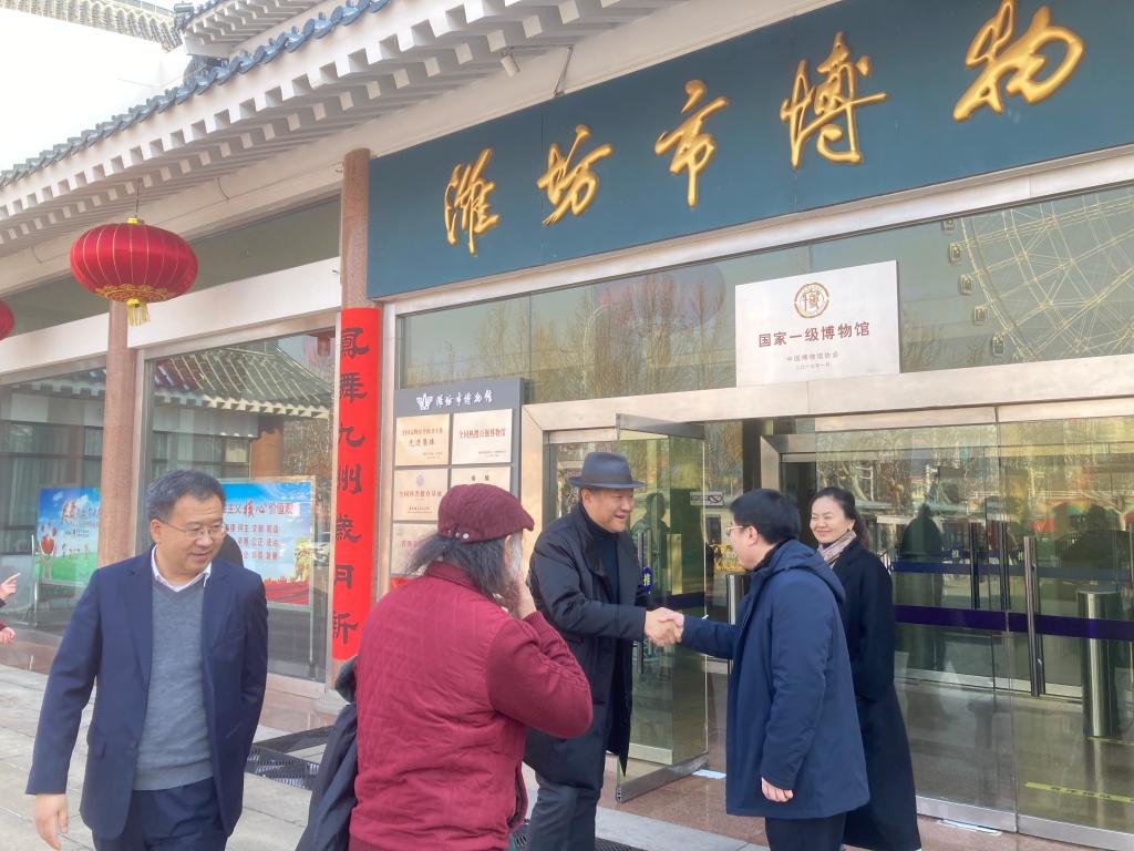 在潍坊期间,徐青峰还看望了在潍坊工作、生活的山艺校友,表达了母校对广大校友的亲切问候和美好祝愿。在1995届文化艺术管理专业毕业生、潍坊市博物馆馆长、潍坊市文学艺术界联合会副主席黄可的陪同下,徐青峰参观了潍坊市博物馆,观摩了有关书画展。