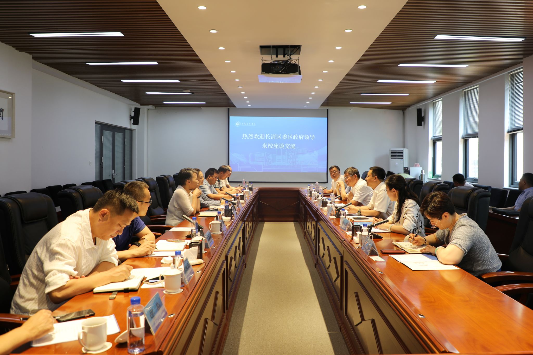 6月18日,长清区委副书记董泽勇、区政府副区长唐金波同志一行6人来我校座谈交流。学校党委委员、副院长荆雷出席座谈会,发展规划处、艺术实践与创作处、设计学院、艺术管理学院、美育研究院和艺术博物馆相关负责同志参加座谈。