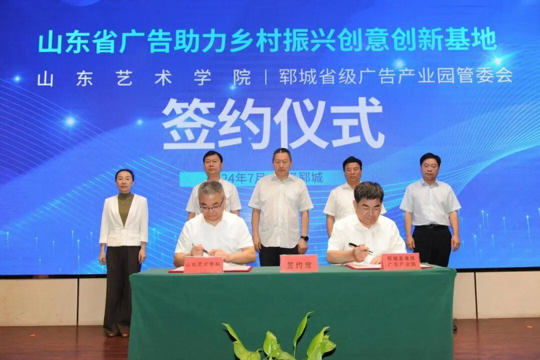 会上,苏茂兴和郓城县政府副县长、郓城省级广告产业园管委会主任王永合就郓城设立广告助力乡村振兴创意创新基地签约,并同与会有关领导为广告助力乡村振兴创新创意基地举行启动仪式。作为第十四届“学院创意杯”广告大赛和颁奖盛典的承办单位,苏茂兴代表学校汇报了大赛的筹备情况和工作亮点。相关领导为第一家县级省属广告协会----郓城县广告协会揭牌。