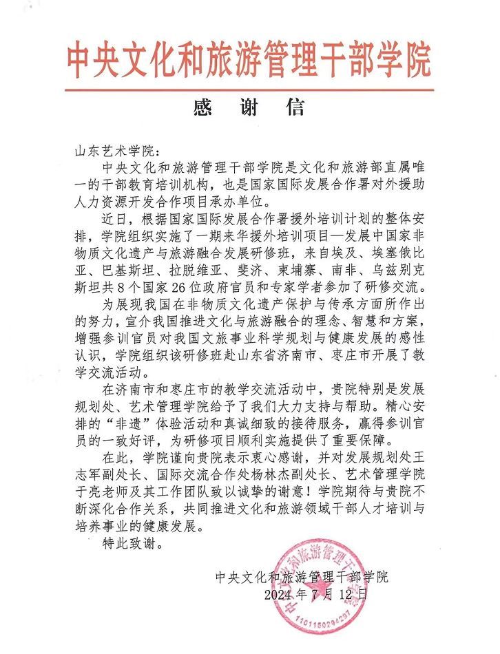 7月12日,中央文化和旅游管理干部学院给我校发来感谢信,对我校给予该校“发展中国家非物质文化遗产与旅游融合发展研修班”项目的支持与帮助表示衷心感谢,并对我校发展规划处副处长王志军、国际交流合作处副处长杨林杰和艺术管理学院于亮老师及其工作团队致以诚挚谢意。