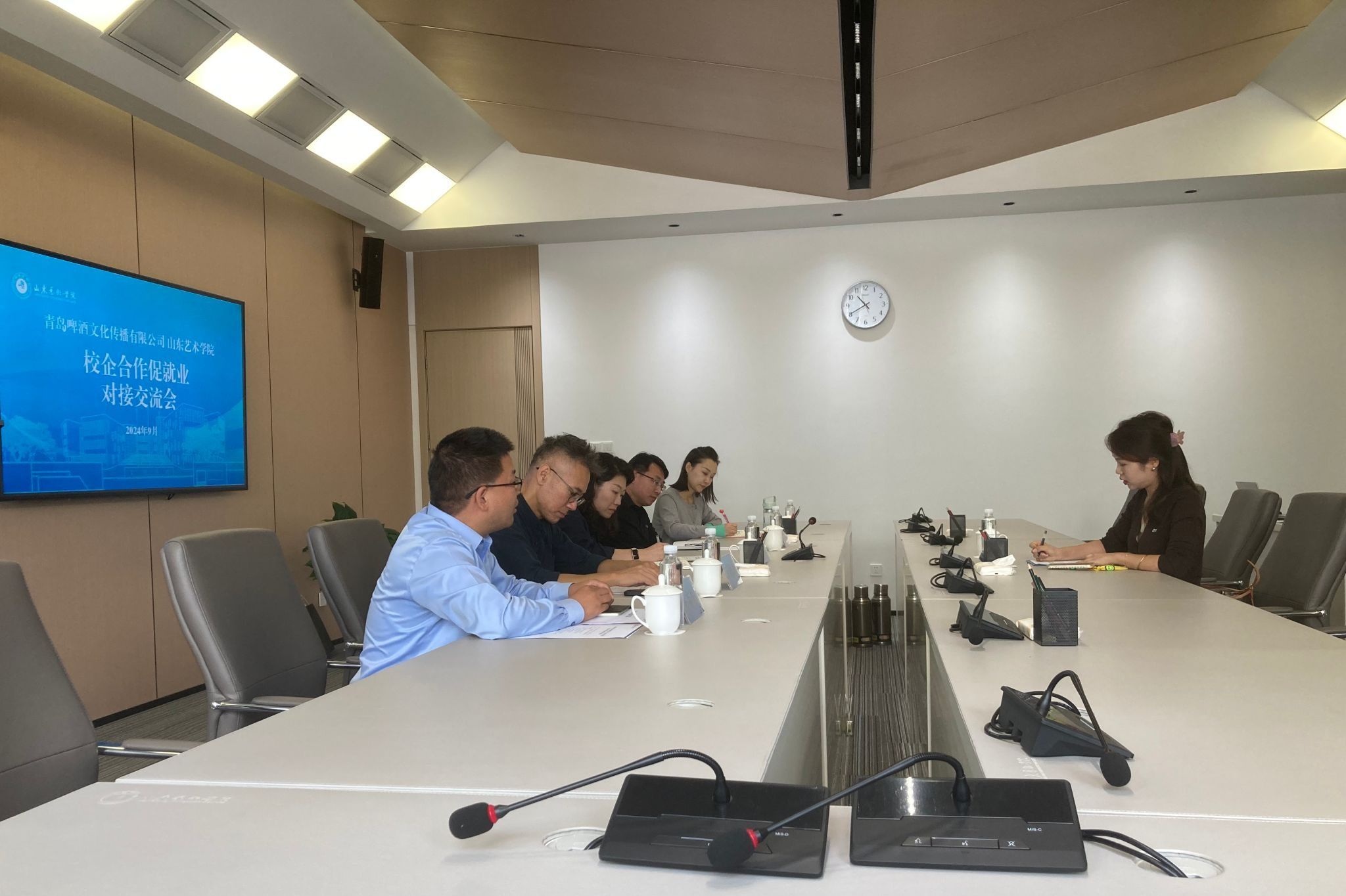 学校发展规划处相关负责同志代表学校对客人的到来表示欢迎,简要介绍了学校的学科专业特色,以及山东艺术学院科研处、设计学院和艺术博物馆与青岛啤酒文化传播有限公司合作的进展情况。与会单位和部门有关负责同志感谢青啤文传对学校人才培养的认可和就业工作的支持,表示下一步将紧密结合各自专业人才培养方案和毕业生就业意向,与对方商定就业、实习的具体事项,实现学生、企业和学校的共同成长,发展共赢。