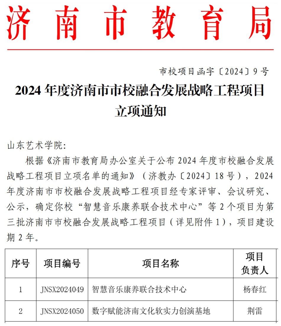 近日,济南市教育局办公室公布了2024年度暨第三批市校融合发展战略工程项目立项名单。经过市教育局组织的形式审查、专家函评、专家会评、现场考察、查重和会议审议等程序并面向社会公示,共有87个项目批准立项。我校申报的“智慧音乐康养联合技术中心”和“数字赋能济南文化软实力创演基地”两个项目榜上有名,至此学校已获批5项市校融合项目。