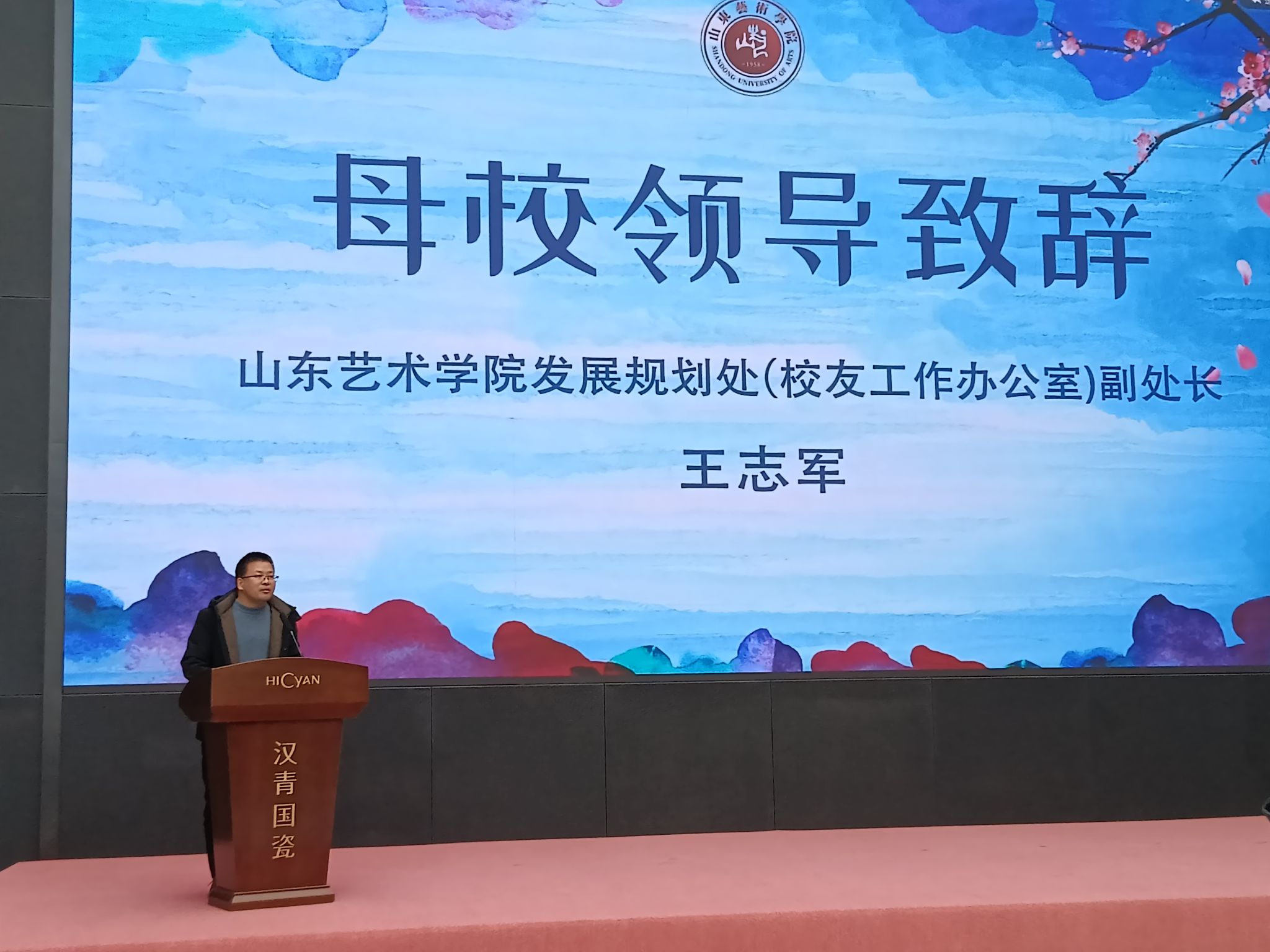 发展规划处(校友工作办公室)相关负责同志致辞,对淄博校友联络处2025年新年联谊会的如期举办表示祝贺,对广大校友与淄博红梅花开合唱团成员的到来表示欢迎,对为联谊会成功举办付出辛劳的校友联络处校友表示感谢,对各位校友长期以来关心支持学校发展表示感谢,通过《山东艺术学院宣传片》介绍了学校的基本情况,向与会校友通报了学校近期发展情况,从校友组织建设、校友文化建设、校友经济建设等方面,介绍了学校的校友工作情况。他表示,校友文化不仅是传承学校精神的重要纽带,更是凝聚各方力量的有力抓手,各位校友胸前佩戴的校徽与校训,是校友文化最集中的载体和最靓丽的名片。“红梅花儿开,朵朵放光彩,香飘云天外。”每一名校友都是母校浇灌的红梅花,他们在各自的岗位上发光发热,将“闳约深美”的艺术芳香传遍神州大地,是学校最骄傲的作品和最有说服力的名片。新年到来之际,祝各位校友和来宾工作生活“巳巳如意”,快乐幸福“生生不息”。
