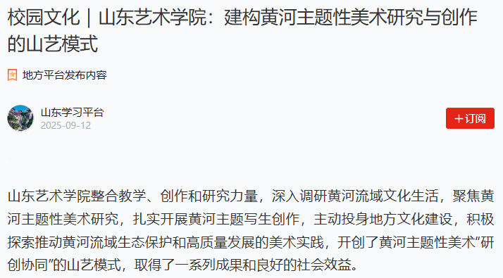 山东艺术学院整合教学、创作和研究力量,深入调研黄河流域文化生活,聚焦黄河主题性美术研究,扎实开展黄河主题写生创作,主动投身地方文化建设,积极探索推动黄河流域生态保护和高质量发展的美术实践,开创了黄河主题性美术“研创协同”的山艺模式,取得了一系列成果和良好的社会效益。
