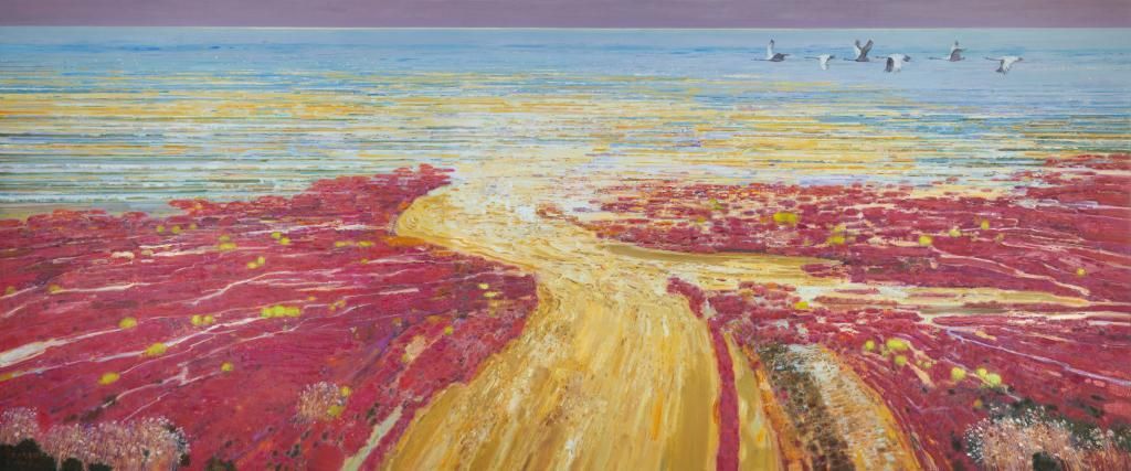 山东艺术学院高度重视黄河主题性美术创作,以风景画和历史画为主线索,善于以风景表达主题,将历史融入风景,重视写生和写实,凸显地域人文和历史,形成了独特的创作风貌。一是重视黄河沿岸的文化考察和写生活动。早在1959年山东艺专创建之初,师生就深入黄河位山水库建设一线体验生活,创作大型国画《举世奇创》;后来在中国美术馆举办《腰斩黄河》大型展览,引发广泛关注和好评。二是围绕国家美术事业开展黄河主题性美术创作。油画《黄昏中的黄河三角洲》开启了黄河生态主题油画创作的新篇章,《黄河三角洲湿地》以写实视角描绘黄河入海口的现实景观;由101幅画面构成的高2米、长161.6米的《黄河》,开创了前无古人的黄河全景风景画;油画《黄河入海口湿地》入选中共中央宣传部、中国文联主办的“筑梦——我们的新时代美术摄影作品展”,以浪漫主义手法表现黄河景观,显示出山艺黄河题材创作的时代价值和精神力量。三是将山东本土文化和革命历史融入到黄河主题性美术创作。入选国家重大历史题材美术创作工程的油画《孙中山视察黄河大桥》,将黄河融入到中国近现代民族历史叙事之中;《刘邓大军强渡黄河》,开始切入中国共产党领导下的革命主题革命历史叙事。
